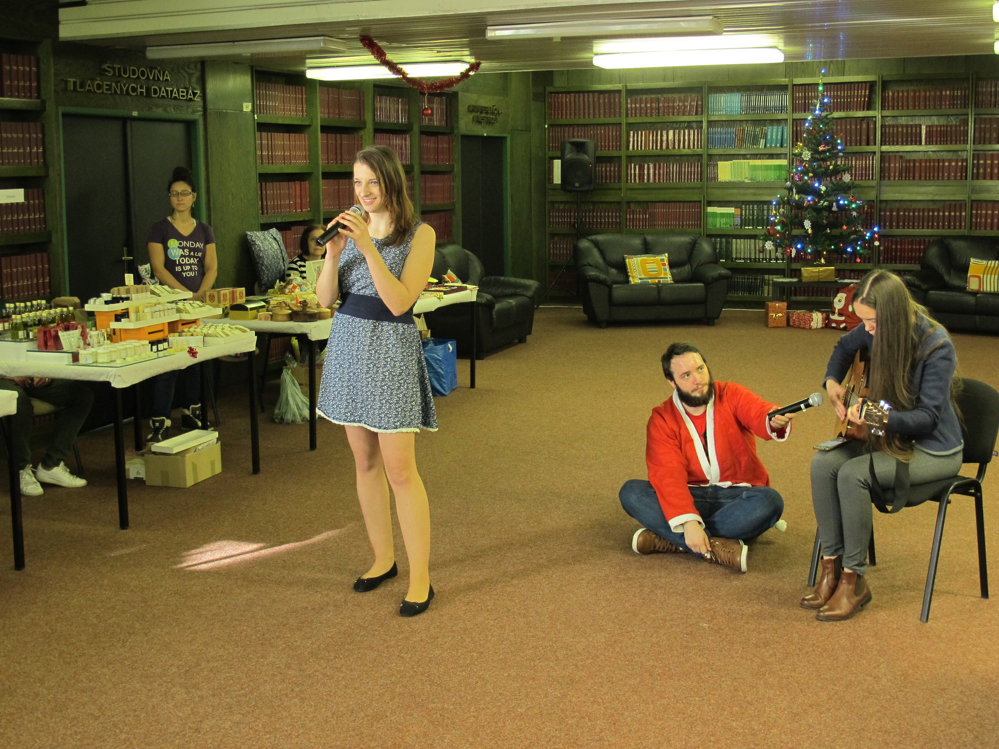 Vianočnú atmosféru jarmoku navodila študentka štvrtého ročníka, Lívia Andrejčáková, Cohenovou piesňou Hallelujah, ktorú vystriedala vianočne rozprávková pieseň Tři oříšky pro Popelku. Jej hlas doprevádzala gitara v rukách prváčky Márie Švecovej.