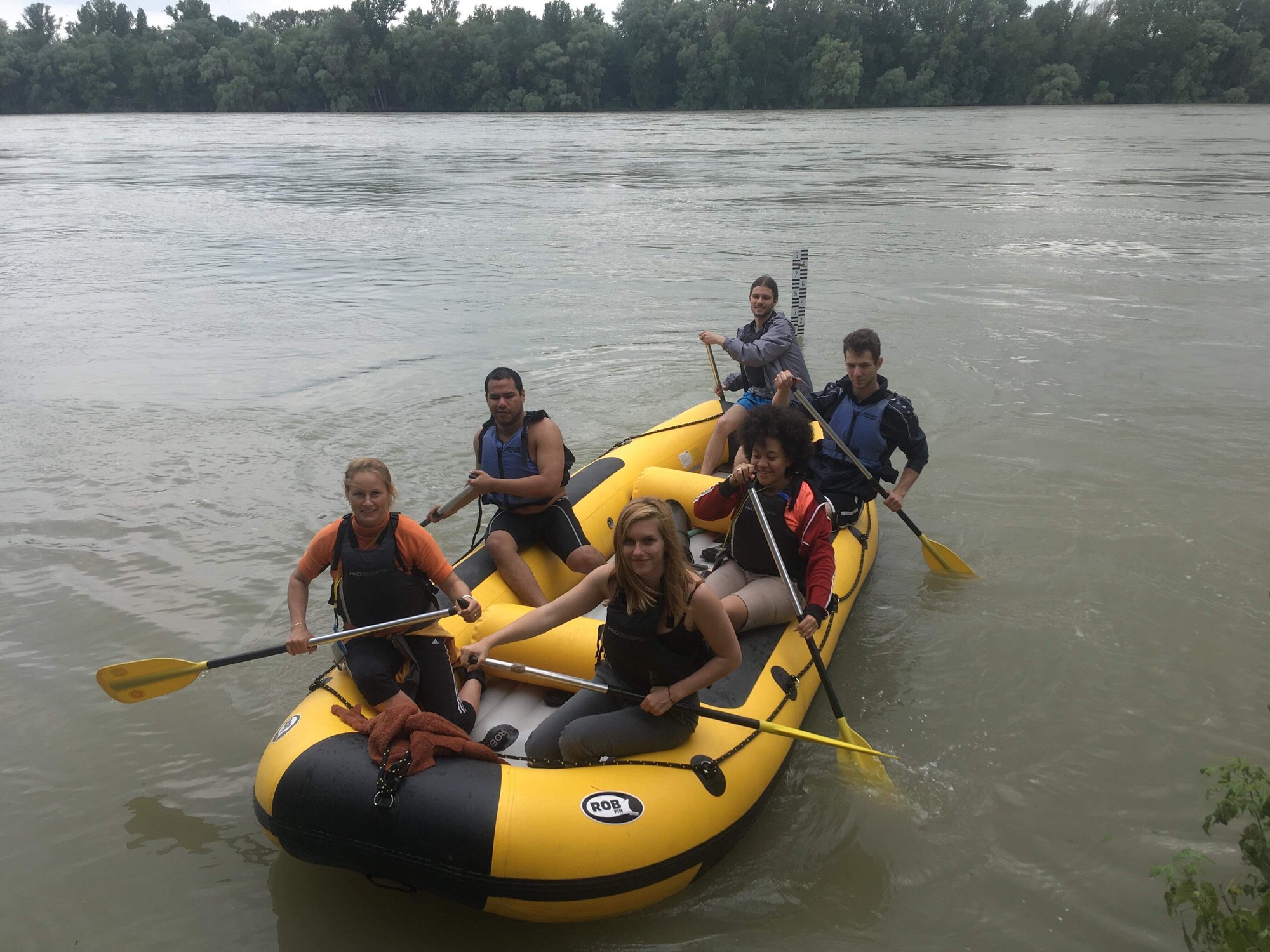 Nakoniec sme semester slávnostne ukončili splavom veľkého Dunaja 6.6. 2019, ktorý bol veru po daždivých dňoch ešte väčší a dodnatejší. Ohlásený 1. stupeň povodňovej aktivity sme zvládli bezpečne na veľkom nafukovacom rafte. Všetci sme boli teda na jednej palube, splav sme zahájili pod Devínom, v mieste, kde sa vlieva rieka Morava do Dunaja. Pod kameňolovom na ľavej strane Dunaja sme vbehli do Karloveskej zátoky, ktorá nás priviedla až domov k lodenici. Bolo nás 6 statočných a každý jeden si vyskúšal aj kormidelnícky post vzadu.