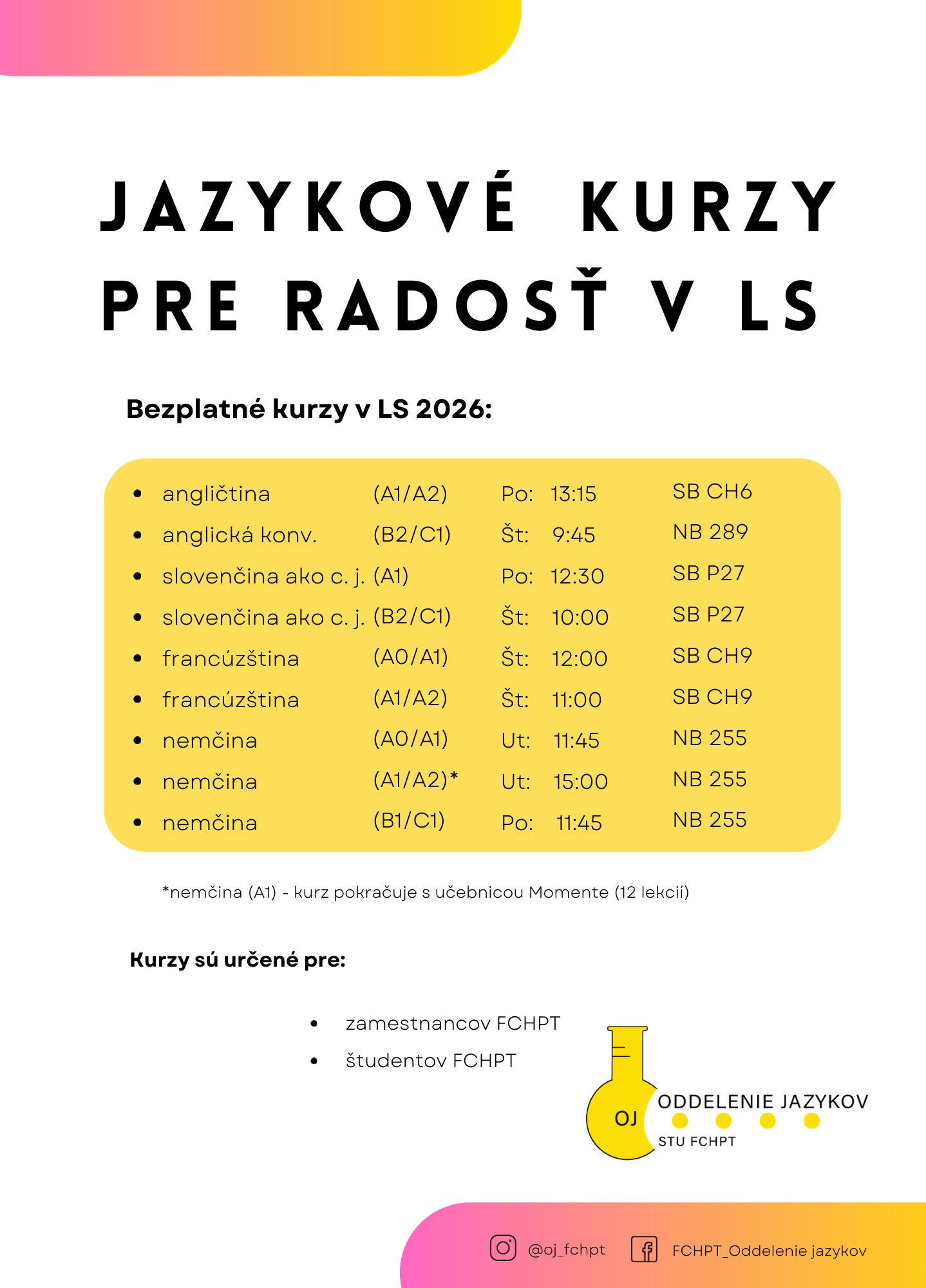 Jazykové kurzy pre zamestnancov a študentov FCHPT v LS 2026
